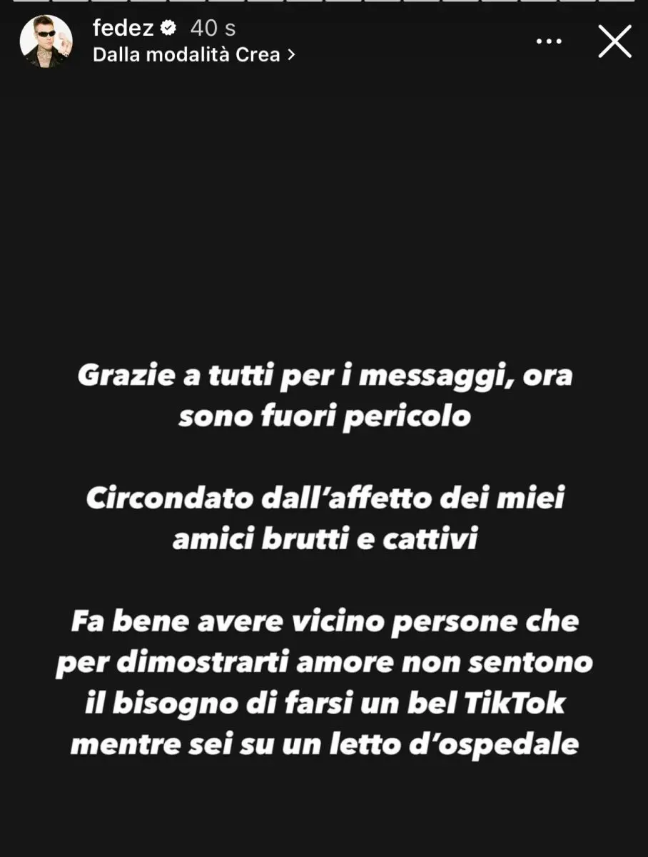 Le parole di Fedez sono abbastanza esplicite. Fa notare quello che in tanti dicono da settimane, ossia che da quando il suo matrimonio con Chiara Ferragni è terminato, è tornato a circondarsi di persone poco raccomandabili. Però poi ha anche scritto: “Fa bene avere vicino persone che per dimostrarti amore non sentono il bisogno di farsi un bel TikTok mentre sei su un letto di ospedale”. Questa frase di Fedez in particolare, è sembrata rivolta alla sua ex moglie. E il fatto che sia improvvisamente scomparsa, non sembra essere un caso. Se fosse stata indirizzata a una persona diversa, forse sarebbe ancora lì. Non solo questa storia, il rapper ne ha scritta anche un’altra. “E’ in questi momenti che capisci che certe persone è meglio perderle che trovarle” queste le parole di Fedez. Anche in questo caso una frecciatina a chi non fa più parte della sua vita?