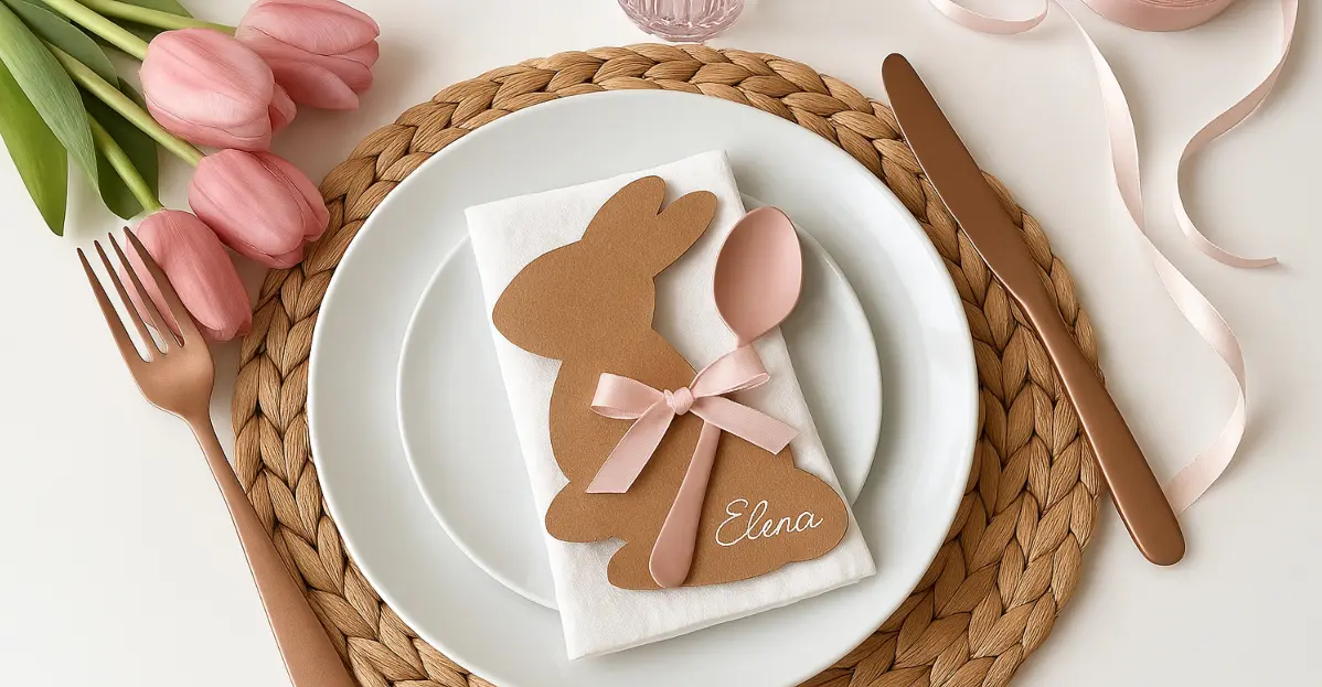 Immagina di accogliere i tuoi ospiti con una mise en place curata fin nei minimi dettagli: piatti candidi adagiati su sottopiatti intrecciati in paglia naturale, posate color rame che riflettono la luce delicata del mattino, bicchieri in vetro rosato, e poi lui, il piccolo protagonista decorativo di ogni posto a tavola: un segnaposto a forma di coniglietto, realizzato a mano, che porta inciso il nome dell’ospite con calligrafia elegante. Accanto, qualche tulipano rosa appena sbocciato e un nastro di raso a chiudere con dolcezza l’intero allestimento.