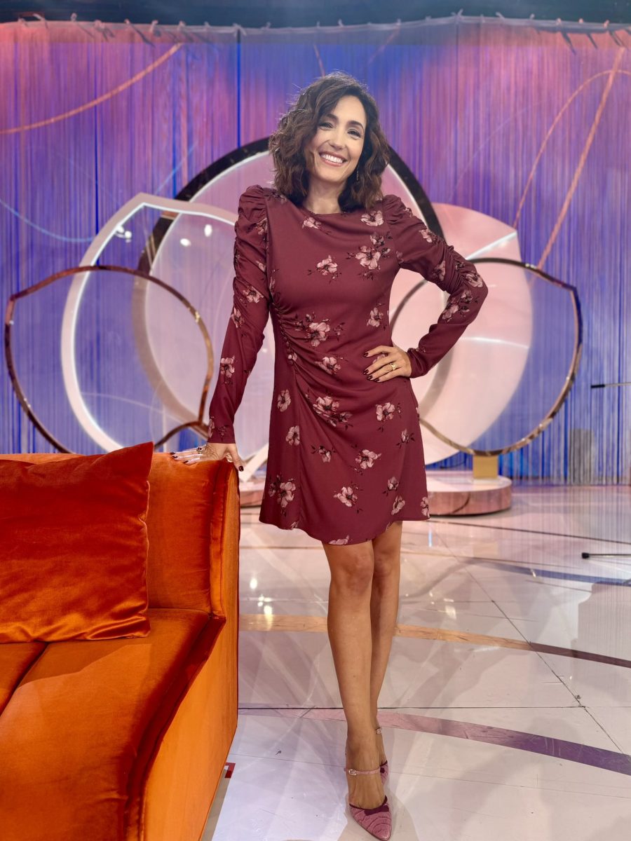 Il set televisivo, caratterizzato da tonalità calde, illuminazioni soft e arredi dai toni aranciati, amplifica ulteriormente il mood autunnale del look, facendo risaltare il colore dell’abito e il sorriso radioso della conduttrice.
