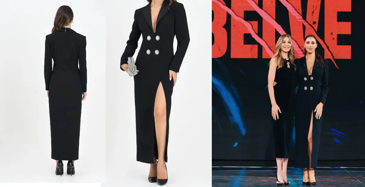 L’abito scelto da Belen è un lungo modello nero in crêpe stretch, caratterizzato da un design ispirato al classico blazer. I revers strutturati e la chiusura doppiopetto con bottoni gioiello aggiungono un tocco di luce e raffinatezza, mentre la linea aderente valorizza alla perfezione la silhouette femminile della conduttrice.