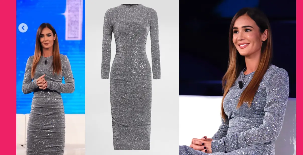 L’abito scelto da Silvia è un longuette a tubino drappeggiato in paillettes argento, dal taglio aderente e sinuoso. Caratterizzato da un girocollo classico e maniche lunghe, il modello disegna una silhouette raffinata che sottolinea la naturale eleganza della conduttrice.