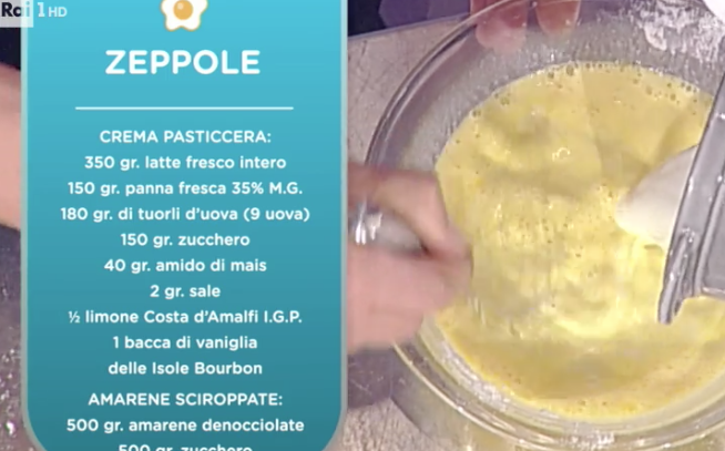 Ingredienti zeppole di San Giuseppe La prova del cuoco ricette Sal De Riso: per la pasta bignè 500 g di acqua, 200 g di burro, 10 g di sale, 500 g di farina 00, 650 g di uova fresche – per le amarene sciroppate: 500 g di amarene denocciolate e 500 g di zucchero – Per la crema pasticcera: 350 g di latte fresco intero, 150 g di panna fresca, 180 g di tuorli (9 uova), 150 g di zucchero, 40 g di amido di mais, 2 g di sale, mezzo limone, 1 bacca di vaniglia