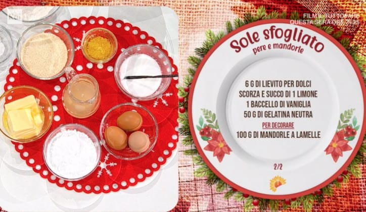 Sole sfogliato pere e mandorle, la torta sfogliata di zia Cri fatta con le pere e con le mandorle, questo il gusto scelto per il primo dolce E’ sempre mezzogiorno del 2021. E’ la ricetta della torta sole, la ricetta che Antonella Clerici dedica a Lino Banfi, l’ospite di oggi in collegamento con la cucina di E’ sempre mezzogiorno. La torta con le pere e la farina di mandorle è perfetta anche con le mele o magari se aggiungiamo delle gocce di cioccolato. Zia Cri suggerisce la stessa torta anche per l’estate ma sostituendo le pere con le pesche. Insomma, è una delle ricette dolci E’ sempre mezzogiorno da provare sempre. Zia Cri con molta cura mostra come si prepara la torta sole sfogliato pere e mandorle e a noi non resta che imparare da lei per regalare altre dolcezze alla famiglia e agli amici.