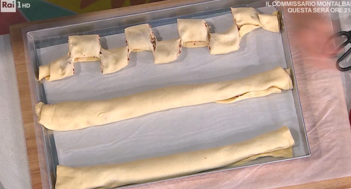 Riprendiamo il ripieno freddo e uniamo il Quark, usiamo anche il formaggio grattugiato che ci aiuterà ad asciugare il tutto. Tagliamo la sfoglia in strisce e sopra stendiamo il ripieno. In questo caso Barbara de Nigris ha diviso in tre parti la sfoglia. Arrotoliamo per lungo dunque la sfoglia. Mettiamo in una teglia ricoperta da carta forno. Incidiamo con la forbice non fino in fondo. E giriamo una sacchetta da un lato e una dall’altro. Spennelliamo con l’uovo. Inforniamo a 200 gradi per 20 minuti.