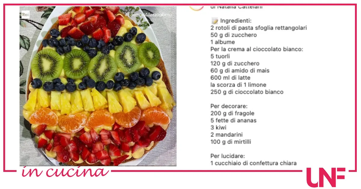 Che bello l’uovo di frutta, l’uovo di Pasqua di Natalia Cattelani. E’ una torta ma in realtà è molto semplice perché usiamo la pasta sfoglia già pronta, farciamo con la crema e poi decoriamo con la frutta fresca, spennelliamo con la gelatina o scegliendo la parte lucida suggerita da Natalia Cattelani ed ecco che il dolce di Pasqua è pronto. Può anche essere un modo molto carino per servire la frutta, frutta e crema e un p’ di pasta sfoglia golosa. Non perdete questa e le altre ricette E’ sempre mezzogiorno, le nuove ricette di Pasqua, ricette dolci e molto semplici. Ecco come si fa l’uovo di crema e frutta di Natalia Cattelani.