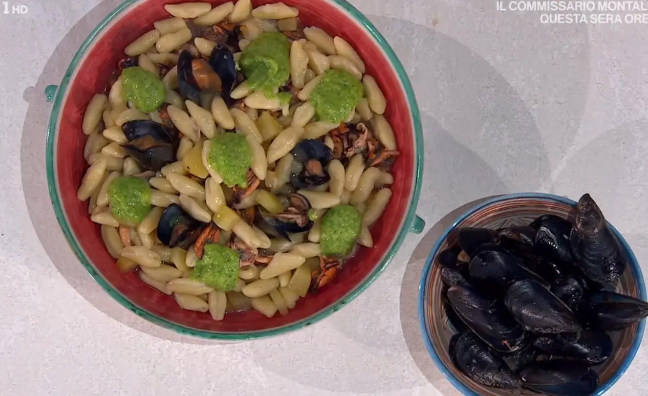 Oggi è martedì 21 aprile 2026 ed è tornata Antonella Ricci a E’ sempre mezzogiorno, questa volta per la sua ricetta del mezzogiorno: cavatelli cozze e cucuzze. Un bel primo piatto tutto pugliese, come la brava e simpatica Antonella Ricci. Se le cozze le puliamo bene e le cuociamo bene non abbiamo problemi, così come mostra la chef di E’ sempre mezzogiorno mentre prepara gli gnocchi, anzi, i cavatelli cozze e cucuzze.