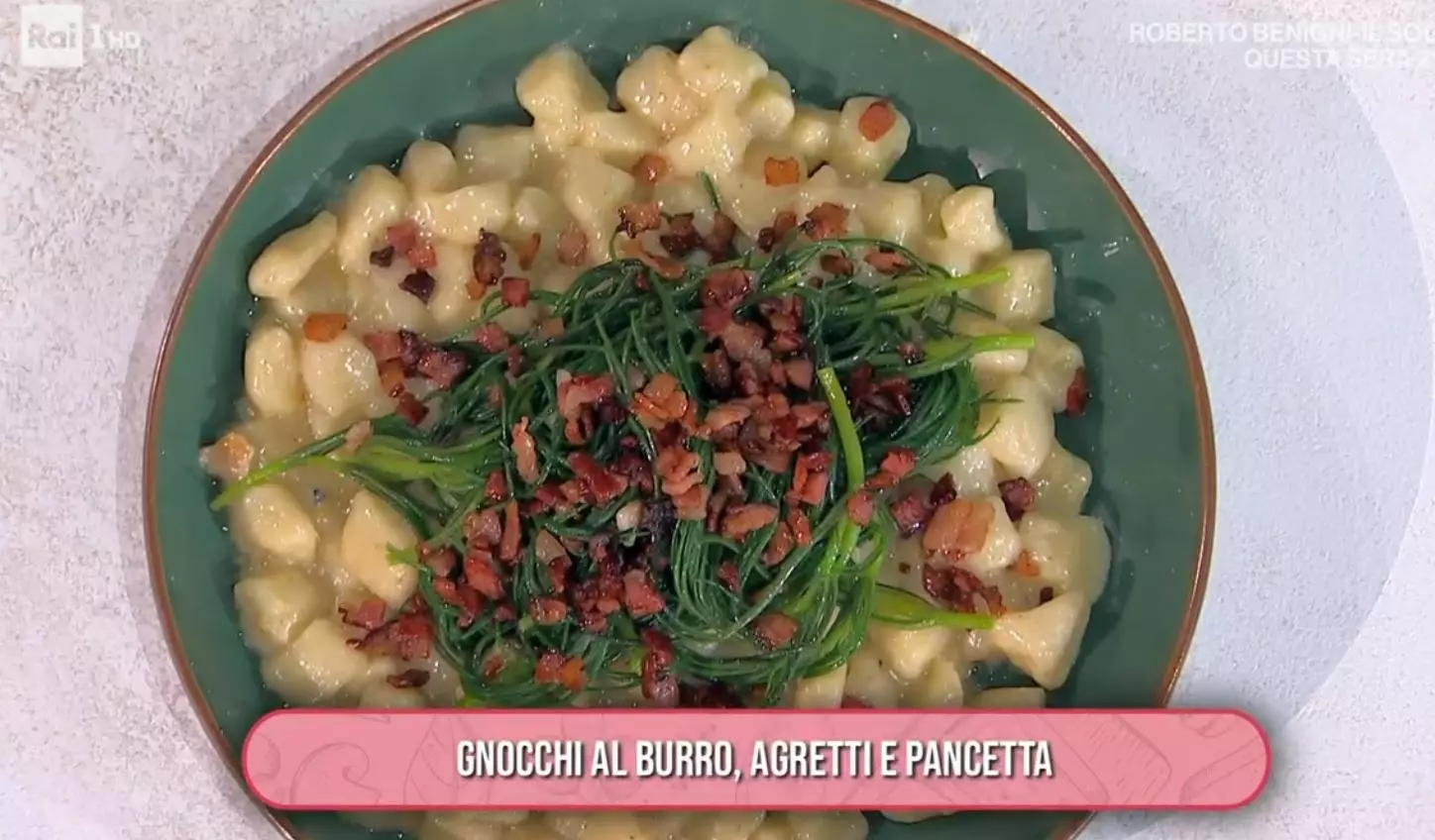 Quando gli gnocchi sono pronti, li saltiamo in padella con un po’ di burro all’aglio. Li serviamo con sopra il condimento di pancetta e agretti che abbiamo preparato mentre gli gnocchi si stavano cuocendo. E la ricetta è pronta. I nostri gnocchi al burro sono serviti. Se volete rivedere tutti i passaggi, potete recuperare la puntata su RaiPlay.
