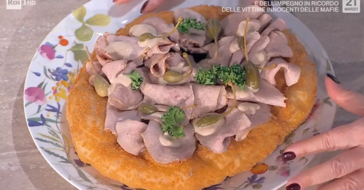 Prepariamo il vitello tonnato, lo tagliamo a fette sottilissime così condiamo la pizza cotoletta con la salsa tonnata e i fiori di capperi. Vi è piaciuta la ricetta di oggi di Fulvio Marino? Magari possiamo preparare questa pizza cotoletta e poi condire con semplice pomodoro e mozzarella. Di certo un gusto nuovo, ogni tanto è da provare, non è una pozza fritta ma è un’idea diversa dalle solite.