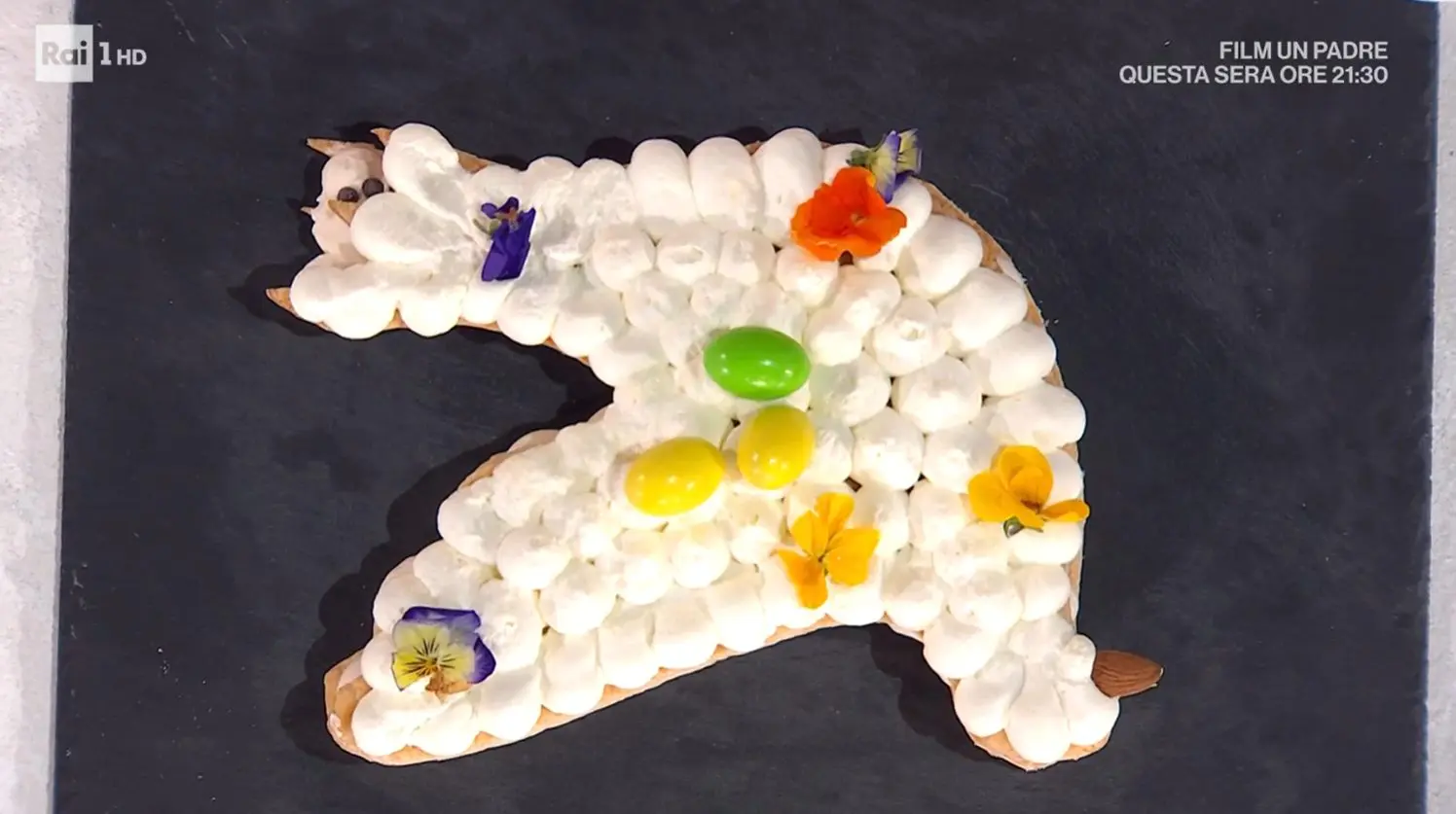 Per completare la colomba furba di Natalia Cattelani decoriamo anche con degli ovetti, il becco lo facciamo con la mandorla. E poi se ci piacciono anche dei fiorellini. L’occhietto possiamo farlo con una caramella o gocce di cioccolato.