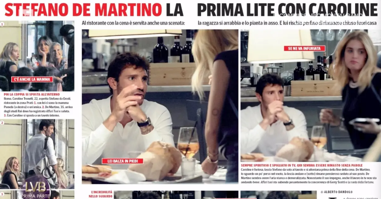 Sul settimanale Oggi, che ha pubblicato le foto della lite tra Stefano de Martino e Caroline Tronelli si legge: “Stefano, terminate le registrazioni del programma Affari Tuoi, raggiunge la fidanzata per cena in un ristorantino in zona Prati, a Roma. Neanche il tempo di sedersi che tra i due è scoppiato un litigio. È soprattutto la ragazza a sembrare molto agitata durante la discussione al ristorante. Gli amici dicono che la 22enne Caroline abbia i nervi a fior di pelle dopo il furto e la diffusione dei loro video intimi per cui la Procura di Roma sta indagando contro ignoti per accesso abusivo al sistema informatico“.