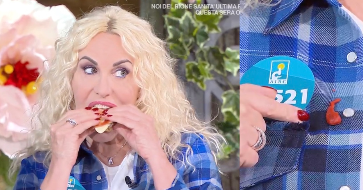 Antonella Clerici non si ferma, si accorge che la salsa rossa ha macchiato la sua bella camicia a quadri ma il panino è troppo buono. Tutti si accorgono della macchia ma lei esclama: “Non succede a chi non mangia!”.