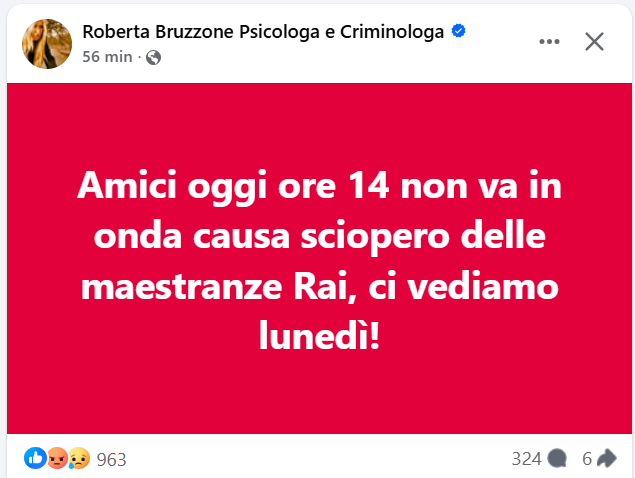 Possiamo però dirvi che al momento non ci sono comunicazioni ufficiali della Rai sulla cancellazione di Ore 14 nel pomeriggio di oggi. Arriva però una comunicazione da parte della dottoressa Bruzzone che conferma che oggi Ore 14 salta.